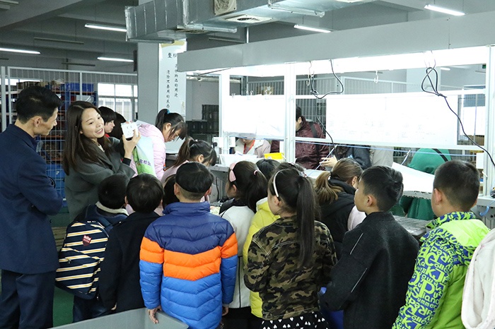 在相關負責人的引領下,“藍豆假日小隊”先后參觀了注塑生產車間,裝配車間,檢測室等工作區域,負責人也對廠內設備、操作流程及生產工藝一一進行了介紹。整齊有序的車間環境,車間工人有條不紊地工作著,轟隆的機器聲在整個車間回蕩,面對這些“素未謀面”的生產設備,孩子們東瞅瞅,西看看,滿是好奇。